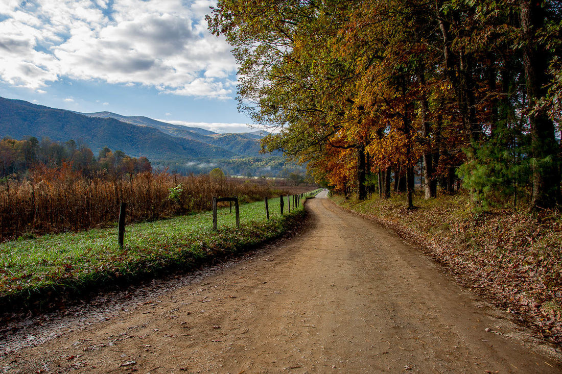 We were at a record high temperature at around 88 degrees when we arrived, but there was a windy cold front predicted for Friday with some rain. The plans were to leave the cabin at 6 AM to make the 38-mile drive to Cades Cove for sunrise pictures. It has been so dry for the last two months that the wind and little bit of rain caused the leaves to completely carpet the highways and made the trip down our winding cabin road and along the park road slow and tentative.